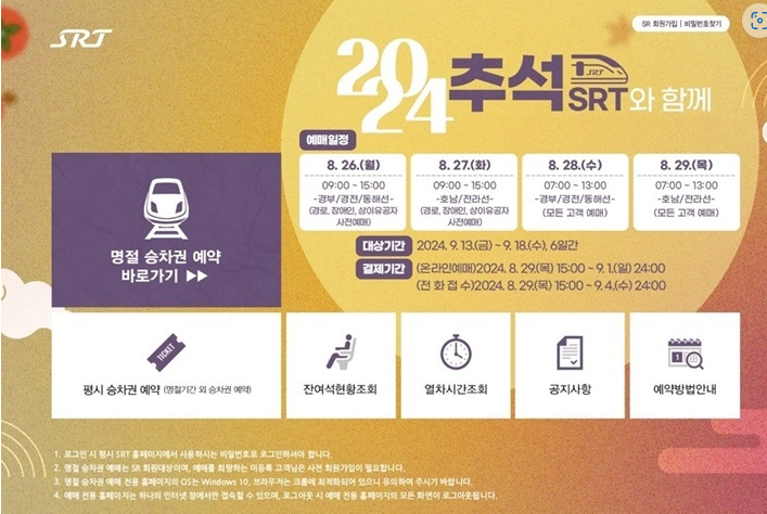 2024년 추석 연휴를 맞아 SRT 승차권 예매기간과 주요 정보를 알려드리겠습니다.